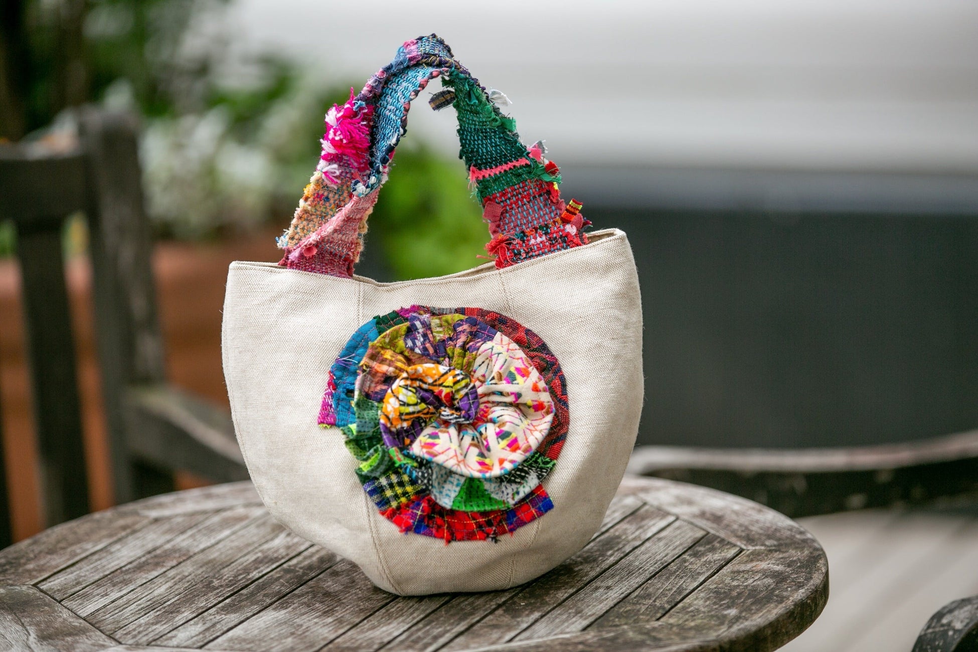 角がない、ボールのような丸い形のバッグ。カラフルなハンドルは、民族衣装のはぎれを所沢市の生活介護施設が裂き織にしたものです。正面のモチーフは、西東京市の障がい者支援施設でつくったリユース素材を立体的な花のカタチに仕上げました。