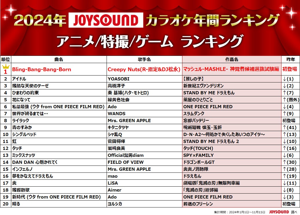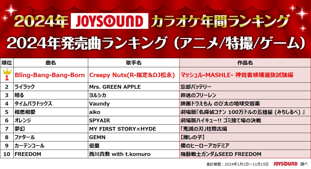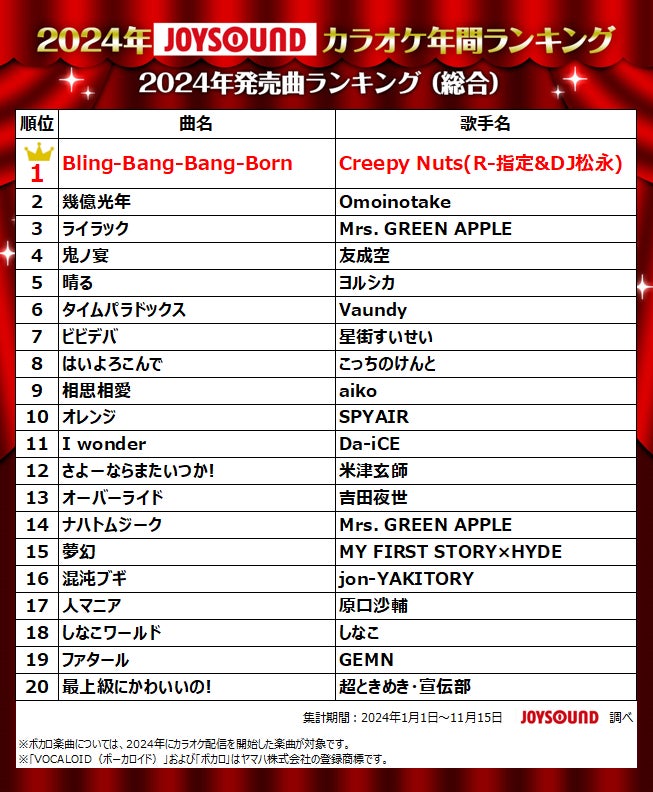 JOYSOUNDがカラオケ年間ランキングを発表!2024年発売曲で最も歌われたのは「Bling-Bang-Bang-Born」!