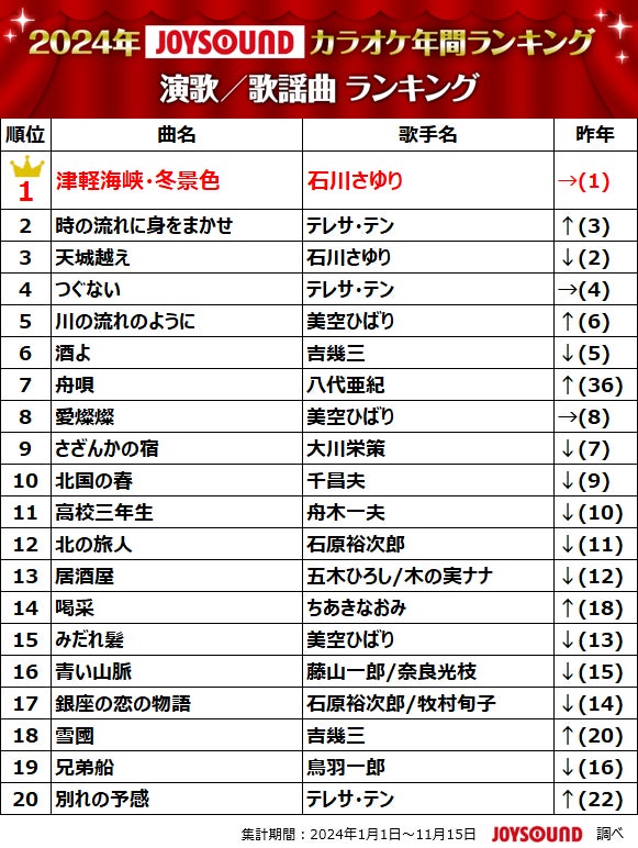 石川さゆり「津軽海峡・冬景色」が根強い人気でトップを独走!2位のテレサ・テン「時の流れに身をまかせ」は、SNSでカバー動画や歌ってみた動画が数多く投稿されたことから、色褪せない名曲の魅力が若年層にも浸透。八代亜紀の代表曲「舟唄」は、昨年36位から大幅に順位を上げ7位を獲得しています。