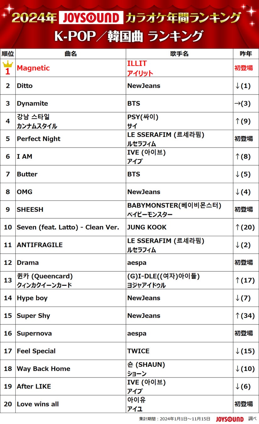 このたび、『2024年 JOYSOUNDカラオケ年間ランキング K-POP/韓国曲ランキング』で「Magnetic」が1位になりました~!