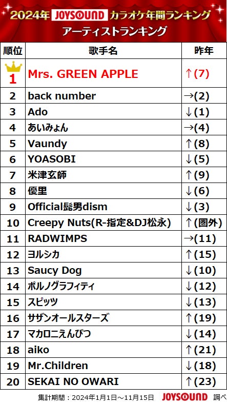 この度2024年JOYSOUNDカラオケ年間ランキング アーティストランキングでMrs. GREEN APPLEが1位になったということで、皆さんたくさん歌っていただきありがとうございます!