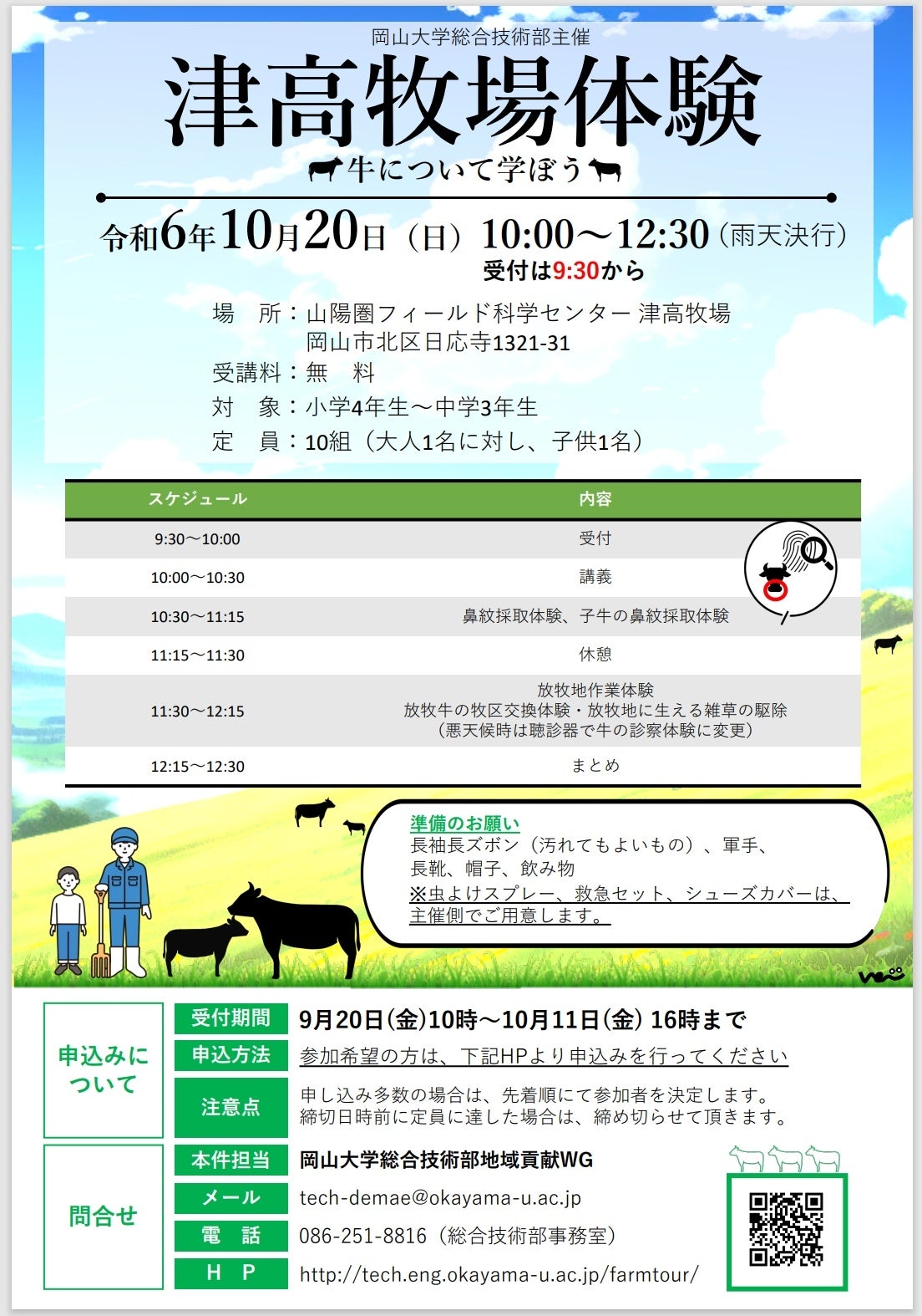 【岡山大学】岡山大学総合技術部「津高牧場体験~牛について学ぼう~」〔10/20,日 岡山大学農学部附属山陽圏フィールド科学センター津高牧場〕