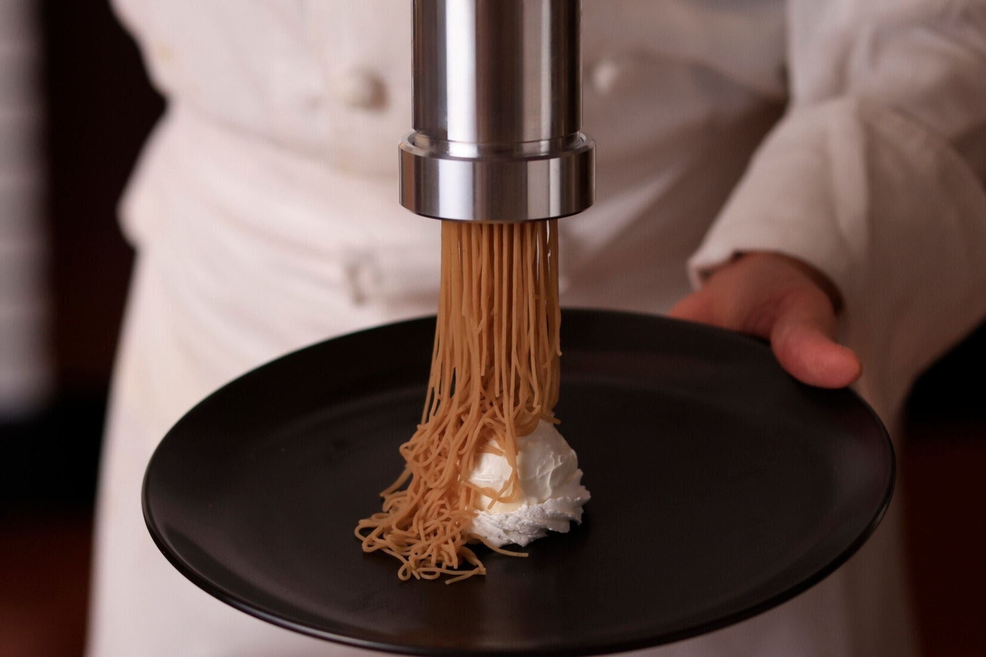 『スーパースイーツビュッフェ 2023~いもくりなんきん~』の目玉スイーツとして、2種の特製ペーストをパティシエがお客さまの目の前で生絞りパフォーマンスを行う「生絞りモンブラン」が登場します。芳醇なミルクジェラートの上に、パティシエ特製のまろやかで極細の生絞りペーストをたっぷりと。11月は王道の“栗”に加えて“焼き芋”が初登場。まるで絹糸のようなやわらかな食感と優しい甘さのハーモニーをご堪能ください。