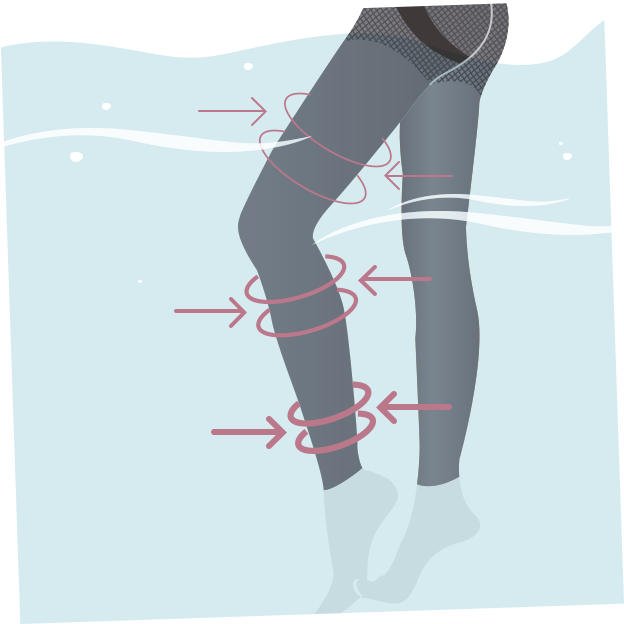 グンゼが独自に設計した「静水圧バランスに基づいた段階着用圧設計」は、静水圧をもとに着圧をバランス分布させた設計で、足首からふくらはぎ、太ももにかけ、快適な引き締め効果が期待できます。