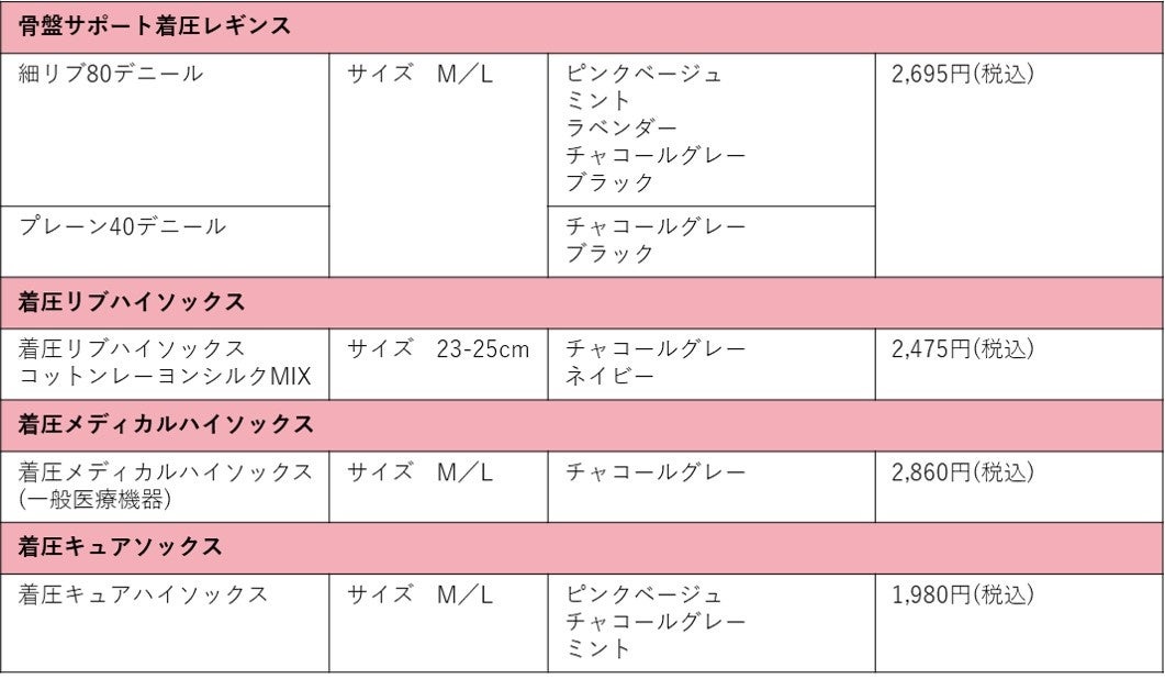この度の新商品には、静水圧*1をもとに着圧をバランス分布させた設計で、足首からふくらはぎ、太ももにかけて、快適な引き締め効果が期待できるグンゼ独自の「静水圧のバランス設計」を全てのアイテムに採用し、骨盤周りを支える「骨盤サポート着圧レギンス」、コットンレーヨンシルクを素材にしたおしゃれなリブ付きの「着圧リブハイソックス」、吸汗・吸湿性に優れた綿混素材で1日中快適な「着圧メディカルハイソックス」(一般医療機器)、ズレ落ちにくく、かかと周りが快適なフィット感の「着圧キュアソックス」の4アイテムが登場します。 *1…胸の高さ(心臓の位置)を静水面としたときの水面下で各部位が受ける水圧の比を示したもの