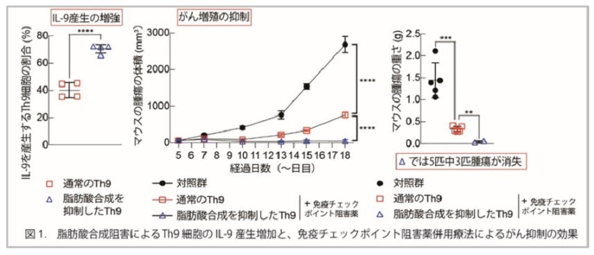 最近の研究で、免疫細胞の一種であるTh9細胞がマウスの腫瘍に対して強い抗がん作用を持つことが明らかになりましたが、その詳細な働きについてはまだ十分に解明されていませんでした。そこで本研究では、Th9細胞の機能制御メカニズムを解明し、がん治療への応用を目指しました。その結果、Th9細胞が作り出す脂肪酸の合成を阻害することで、がん抑制効果が向上することを発見しました。また、脂肪酸合成を阻害したTh9細胞と免疫チェックポイント阻害薬を併用すると、がんがほぼ完全に消失することも確認されました。