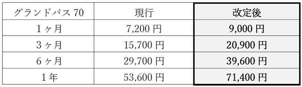 近年、燃料価格をはじめとする各種物価の上昇や、人材確保・処遇改善に要する費用の増加など、路線バス事業を取り巻く経営環境は引き続き厳しい状況にあります。こうした中にあっても、公共交通機関として安全・安定した輸送サービスを将来にわたり継続して提供していくため、今後も安定した制度運営を図る観点からグランドパス70の運賃を見直すことといたしました。