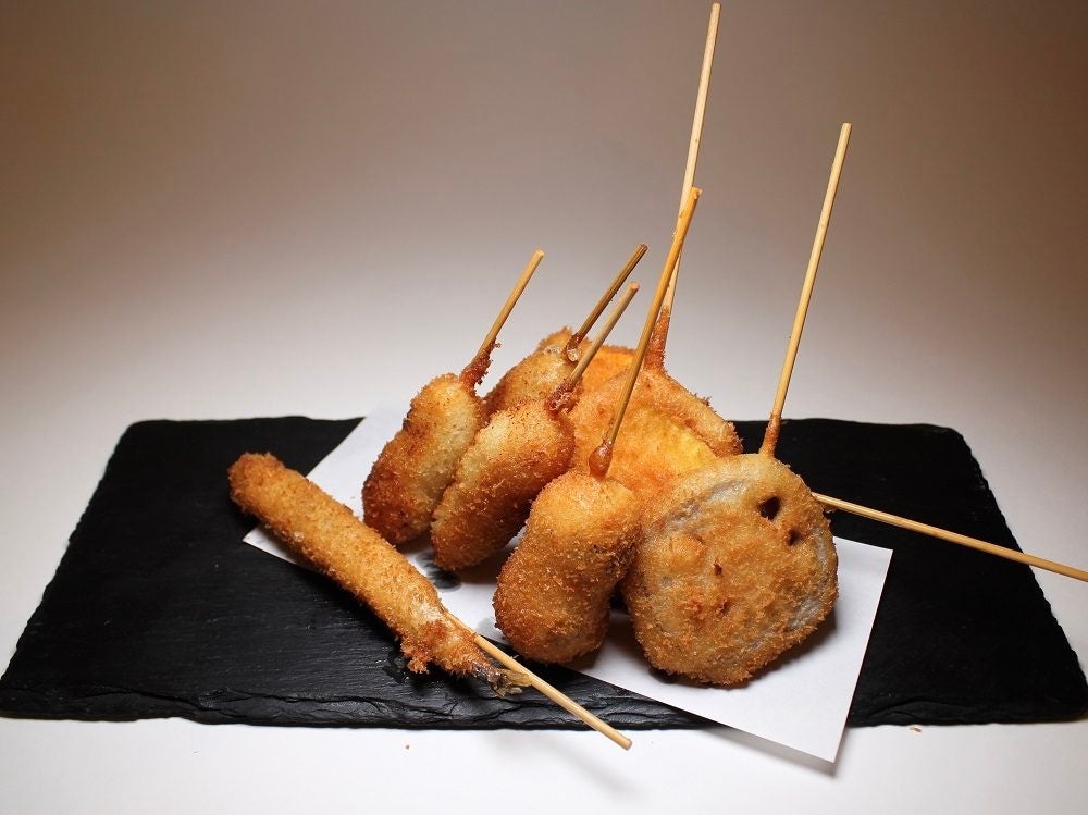 「G20大阪サミット」にも出店経験のある串カツ専門店<くしよし本店>。衣にはクロワッサン生地を使用しており、サクッと軽い食感が特徴。付属のソースにもこだわっており、野菜串には 野菜や果実をベースとしたオリジナルソースを、肉と魚介は甘味と辛味と香りに特徴を持たせたマスタードソースをたっぷりとまとわせるのがおすすめ。