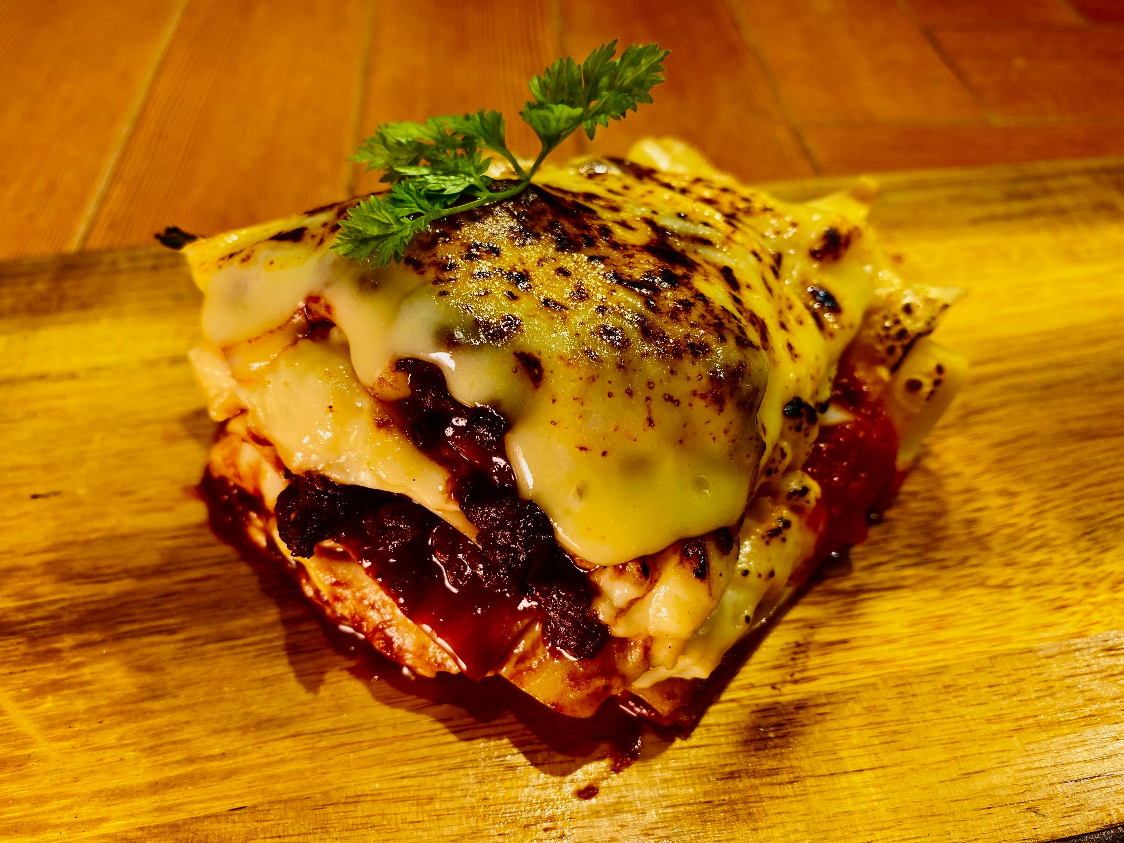 こんがり焼けたチーズと中からとろけ出すベシャメルソース、ほんのり赤ワインの香るミートソースがベストマッチ!こだわりのミートソースには、大阪のブランド牛『なにわ黒牛』を使用しています。
