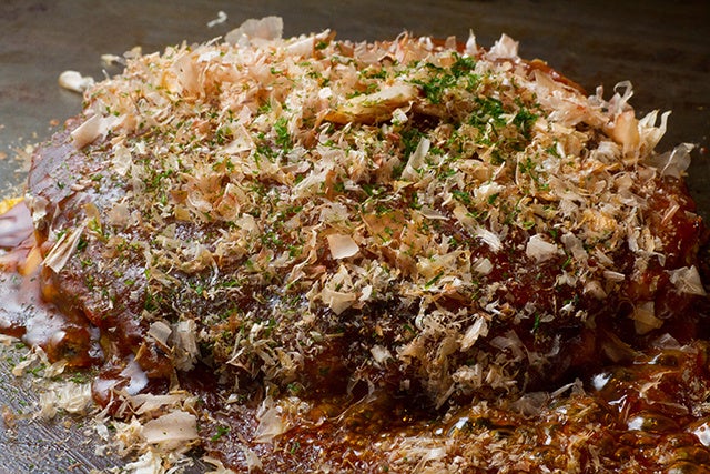 「ミシュランガイド京都・大阪2017」のビブグルマンにも選出された大阪・難波のお好み焼き店<味乃家(あじのや)>。「味乃屋ミックス お好み焼き」は豚肉・イカ・タコ・エビ・豚肉のミンチ・卵2個が入ったお店で人気ナンバーワンのお好み焼きです。