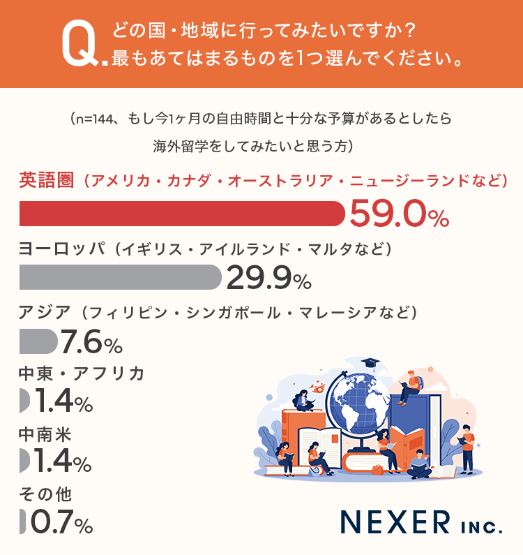 最も人気だったのは「英語圏(アメリカ・カナダ・オーストラリア・ニュージーランドなど)」で59.0%と過半数を占めました。