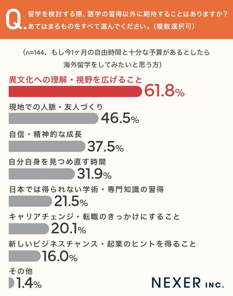 続いて、海外留学をしてみたいと回答した方に、語学の習得以外に留学に期待することを聞いてみました。