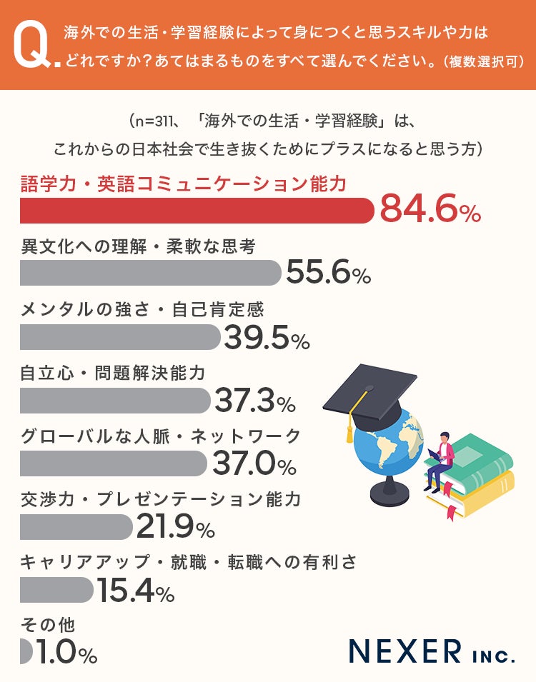 海外での生活・学習経験が「日本社会でプラスになる」と約62%が回答。語学力だけじゃない、期待されるスキルとは?
