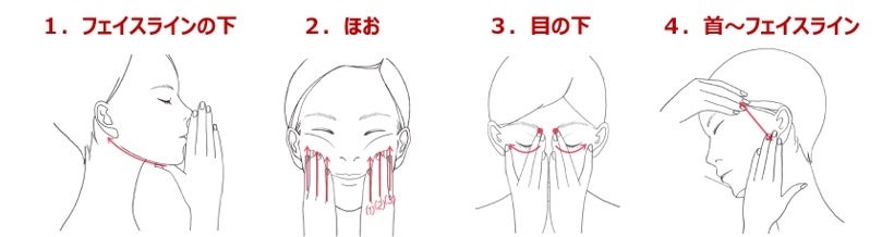 4本指で図の1~3の順に、フェイスラインからほお骨の下のくぼみまで持ち上げます。(図1~3を1セットとし、6回)