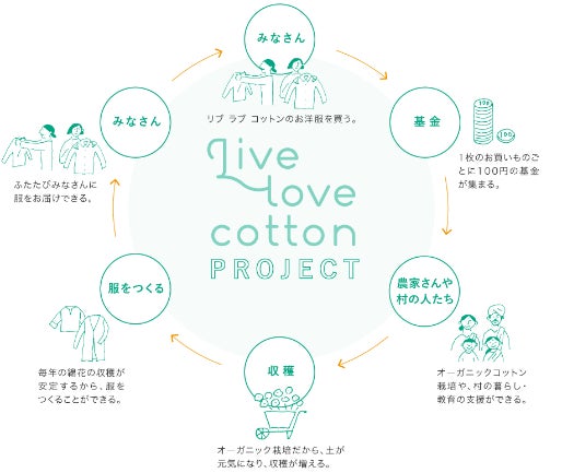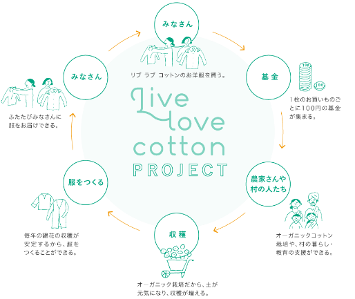 リブインがめざしているのは、循環するプロジェクトです。基金付き製品を販売し、集まった基金で再びオーガニックコットンが栽培されています。収穫したオーガニックコットンで新たに製品がつくられ、再びお買い物を楽しんでいただける機会へつながる、参加するすべての人の笑顔や、豊かで健やかな大地へ恩返しできるような仕組みが目標です。洋服を購入すると、1枚につき100円は「Live love cotton基金」として運用されます。(基金部分は非課税)