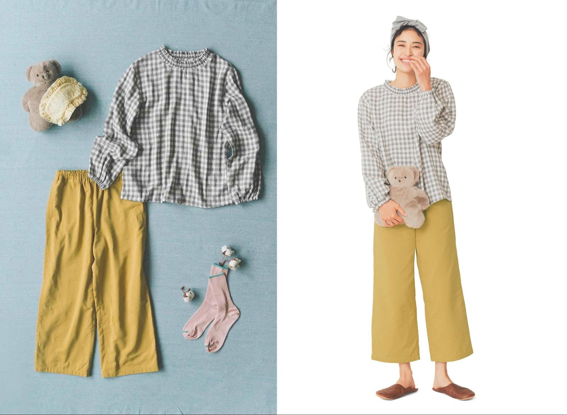 ダブルガーゼがやわらかく、オーガニックコットンの心地よさを堪能できるスペシャルなパジャマです。ゆったりシルエットで寝返りが楽ちんで、シャーリングゴムの衿ぐりで着脱にも気を使いません。 カラーは気分が明るくなるグレーギンガムとマスタードです。