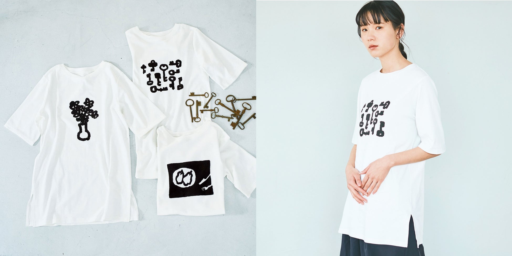 「しあわせを感じる瞬間」をテーマにしたイラストがプリントされた、インドオーガニックコットンのTシャツです。イラストレーションは画家の林青那さんが墨汁と筆による墨一色で描いたものです。深い黒と大胆な線で描かれたモチーフが、装いのスパイスになります。さらりと着ても決まるスリット入りです。