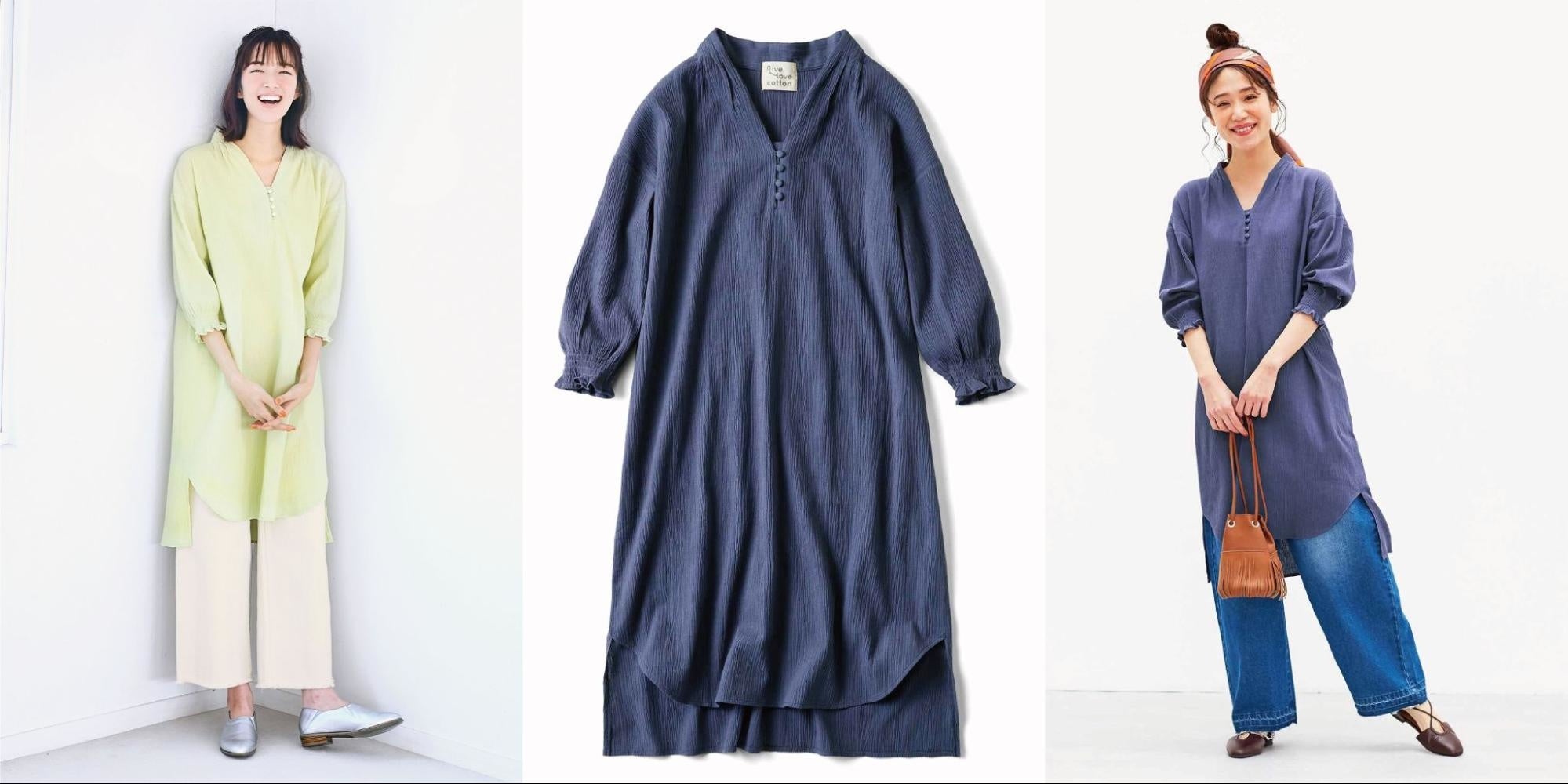 着るだけで〝抜け衿〟になって大人のリラックススタイルが完成する、ロングセラーのチュニックが長め丈になりました。スカートやワイドパンツと合わせると今季らしいゆるりとした重ね着のコーディネートを楽しめます。フロントの衿に寄せたタックやスリット、ラウンドヘム、七分袖など、軽やかですらりと見える工夫がなされています。