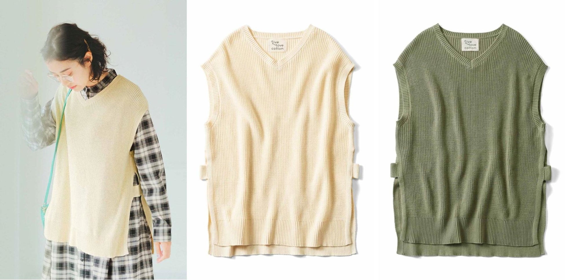 オーガニックコットン100%の軽やかなニットベストです。Tシャツやワンピースに重ねるだけで、旬のコーデを楽しめます。サイドが開いているので、ボリュームのある服と重ねてあわせてもすっきりと見え、ゆるVネック&ドロップショルダー風のラインが体形をカバーして着やせをかなえます。
