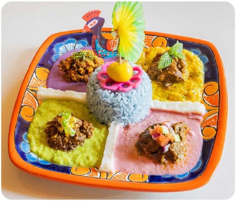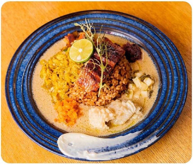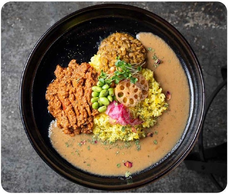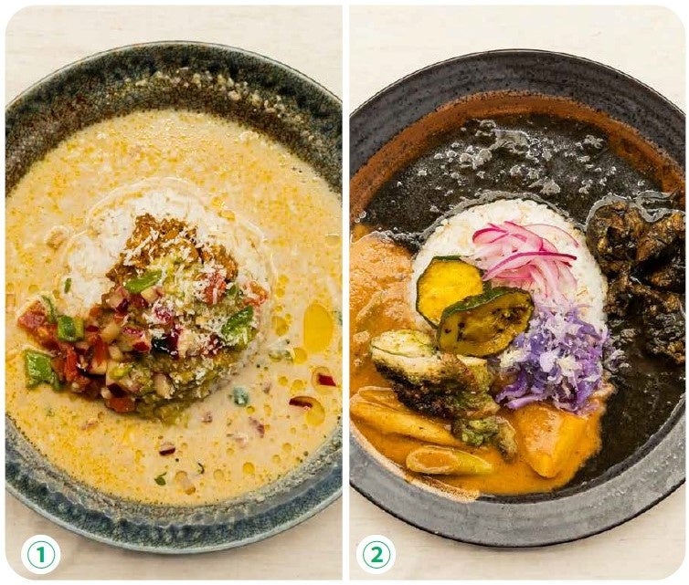 本来とうもろこしの粉で作られるトルティーヤをコーンポタージュに代え、タコミートの代わりにセミドライチキンとアボカドのワカモレをトッピング。自家製の炭焼きオイルを加えてスモーキーな香りをプラスした“スープカレータコス”。西インドのポークビンダルにイカスミを加えた自慢のカレーに、マイルドな野菜と豆カレーを添え、スパイシーな大葉のジャークチキンをトッピングした“豆と野菜のカレー”。