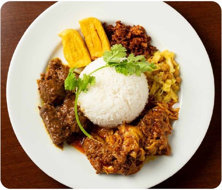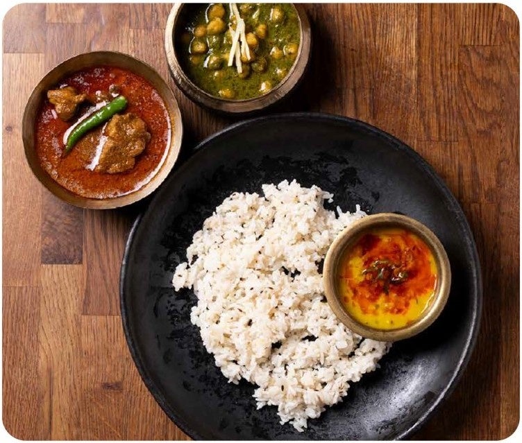 スパイスカレーを中心にアジア各国の料理を提供する「スパイスカレーまるせ」とインド料理のレシピ本2冊を上梓したシタール奏者 石濱匡雄のコラボは、インドの列車で提供されている食事を再現。列車マトンとして現在も親しまれるカレーは英国領時代に辛さを抑えてマイルドな仕上がりにしたもので、そのほかダールや副菜などバランスの整ったメニュー構成は日本に居ながら旅気分を味わえるプレート。