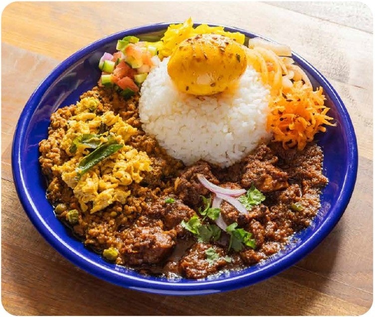 「インド食堂アンジュナ」の代名詞ともいえるキーマカレーと「スパイスタリテマスカ?」で大人気のチェティナードチキン。今回限りの特別なあいがけプレートには、トッピングにスパイス炒り卵の“エクーリ”やスパイスオイルに漬け込んだ“スパエッグ”をつけるのがオススメです。