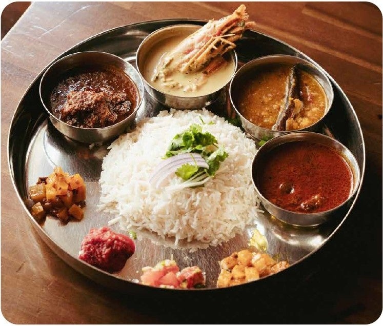 インド料理を中心としたメニューで愛される2店舗による、初のコラボプレートが完成!夏野菜を使ったマトン挽き肉のカレーと、夏らしい酸味とココナッツが香るインド・ケララ州のフィッシュカレーをメインに、季節の野菜を使った副菜をたっぷり添えました。夏にぴったりの、爽やかな味わいを楽しんで。