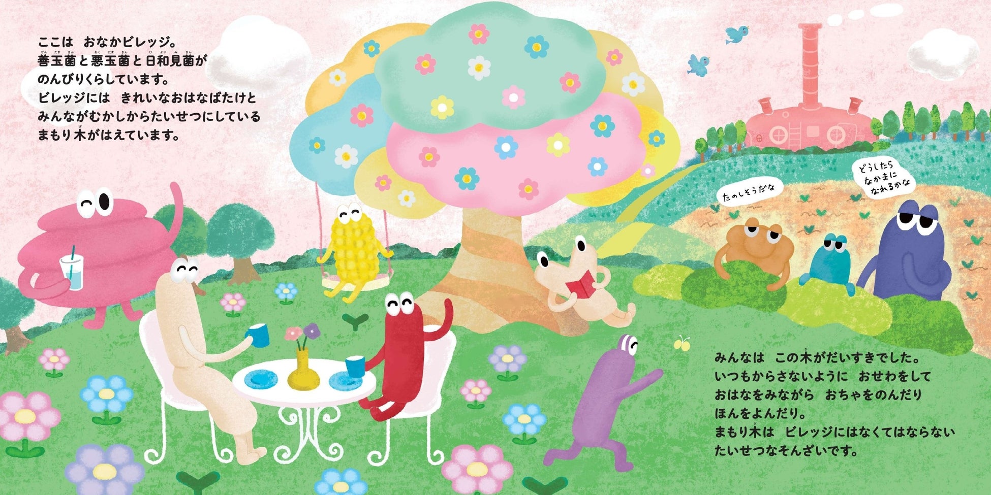 この絵本はわたしたちの体のおなかの中を舞台にした物語です。おなかの中は、お花がたくさん咲いた「おなかビレッジ」として描かれ、そこに暮らす、善玉菌、悪玉菌、日和見菌がとてもかわいいキャラクターとなって登場します。