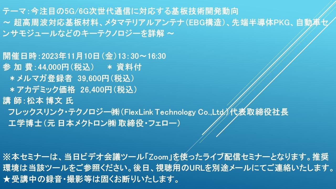 テーマ:今注目の5G/6G次世代通信に対応する基板技術開発動向 ~ 超高周波対応基板材料、メタマテリアルアンテナ(EBG構造)、先端半導体PKG、自動車センサモジュールなどのキーテクノロジーを詳解 ~