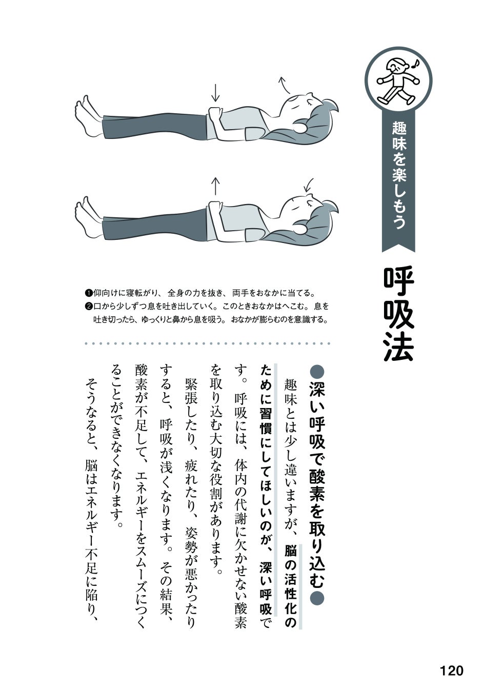 「ストレスは脳の老化を加速するので、イヤなことはやらなくていいんです」と白澤氏。今日からすぐできる、簡単な呼吸法やストレッチも紹介しています。