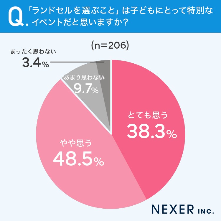 「とても思う」が38.3%、「やや思う」が48.5%で、合わせて86.8%の方がランドセル選びを特別なイベントだと感じていることがわかりました。