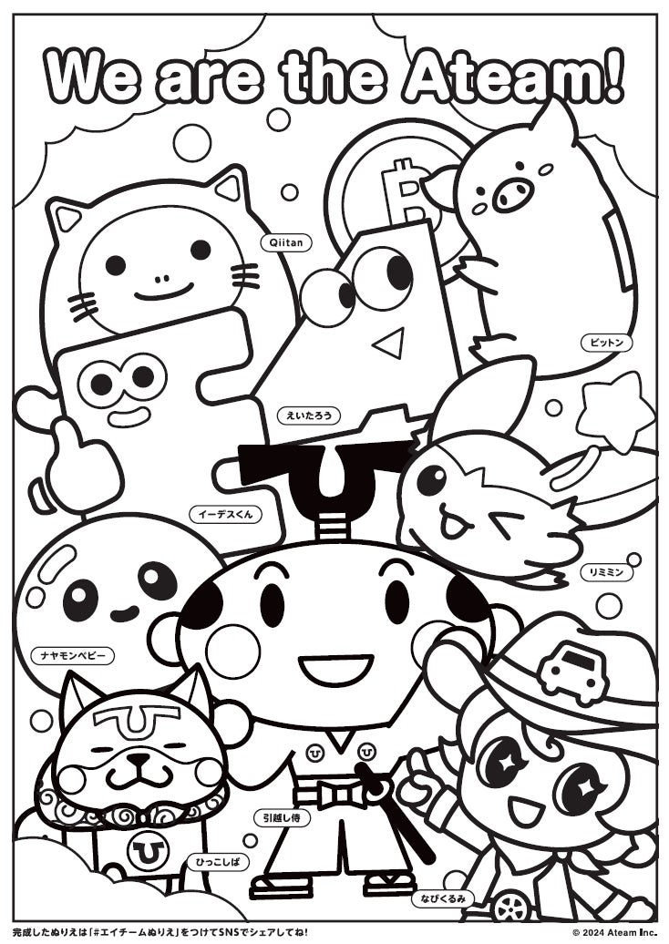 2022年より毎年、社員のご家族向け社内報「Ateamかぞく報」を発刊し、社員及びご家族の皆様へお届けしております。2024年11月に発刊したVol.3では、設立してからの24年間のエイチームの成長を支えてきた各サービスのキャラクターを集結させた塗り絵を付録としてプレゼント。社員やご家族の皆様から大変ご好評いただきました。そこで、WEB ダウンロード版としてリリースする運びとなりました。ぜひ、エイチームのキャラクターたちを楽しんでいただけると嬉しいです。