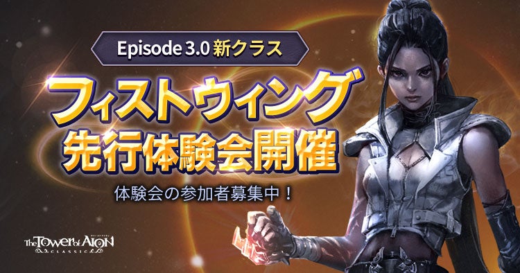 PC向けオンラインゲーム『The Tower of AION(以下、タワー オブ アイオン)』をサービス、運営しているエヌ・シー・ジャパン株式会社(本社:東京都港区、代表取締役会長:金 澤憲(キム テクホン)、代表取締役社長:林 元基(イム ウォンキ)、以下エヌシージャパン)は、クラシックサービスにて次期大型アップデート『Episode3.0”永遠の拳”』の決定および事前登録開始と、先行体験会の開催決定をお知らせします。