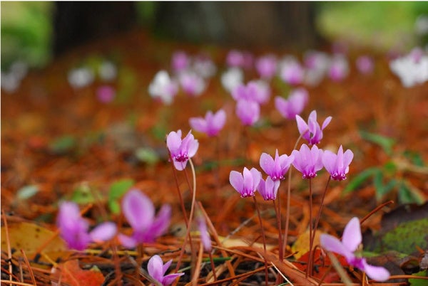 フランス、イタリア、ギリシャなどヨーロッパが原産とされるシクラメンのうち、秋咲きの本種は本格的な秋の訪れとともに白やピンクの小さい花を咲かせます。人の手による品種改良が行われていない原種のため、花は小ぶりで控えめですが、花期が長く、木陰に群生する様子は見ごたえがあります。