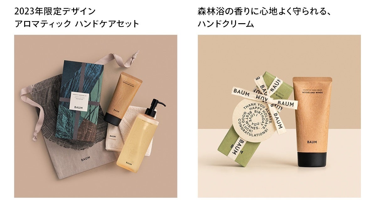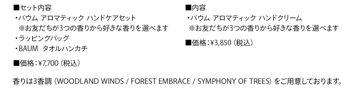大切な人の心地よい日々を願いながら、樹木のギフトを。ギフトとして人気の高いハンドクリームとハンドウォッシュが、ギフトにぴったりな限定デザインのボックスに入った「アロマティック ハンドケアセット」や、BUAMオリジナル「タオルハンカチ」が付いたLINEギフト限定セットなど3つの森の香りからお好きな香りをお選びいただけます。無償のリボンラッピングが施されたアイテムにも注目です。