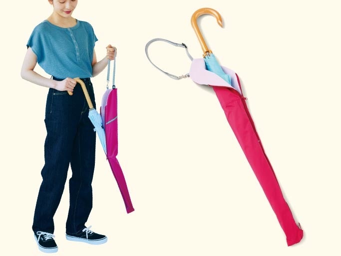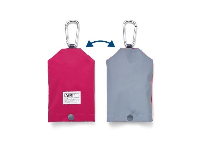 傘を回しながら入れるだけで水滴をふき取り、手をぬらさずにすっぽり収納できる傘袋。傘袋があることで、服やまわりの物がぬれる不快感を解消して、持ち運びがらくちんです。晴れの日も持ち歩きやすいよう、収納ケース付きです。傘袋の上部ラインと収納ケースにリフレクター素材が使われていて、夜道を安心して歩くことができます。夜だけリフレクターを持って出掛けよう、と思っていても、うっかり忘れてしまいがち。普段から持ち歩けるデザインにすることで、持ち忘れが減りそうです。収納ケースの片面はリフレクター、もう片面はビビッドなピンク色になっています。