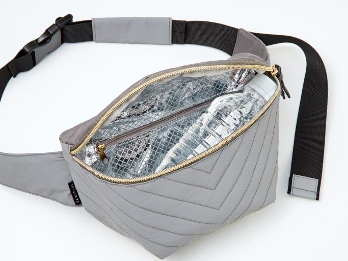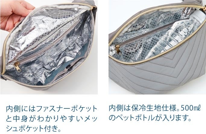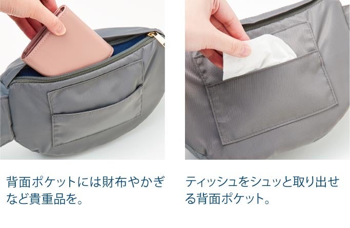 前面とサイドの帯にリフレクター素材を使い、夜道でキラリと存在を主張するボディーバッグ。ふだん使いしやすく、また男女兼用で使えるデザインで、家族で一緒に使っていただけます。内側にはファスナーポケットと、中身がわかりやすいメッシュポケット付きです。内側には保冷生地を使用しているので、暑い日に冷たい飲み物を持ち運ぶことができます。また外側にはティッシュを引き出せるポケット機能も充実しています。ショルダーベルトには、面ファスナーで取り外しできるリフレクターバンドも付いています。背面にもリフレクターが来るよう、バンドを取り付けました。コンパクトなバッグでありながら、外出時に嬉しい機能が満載です。