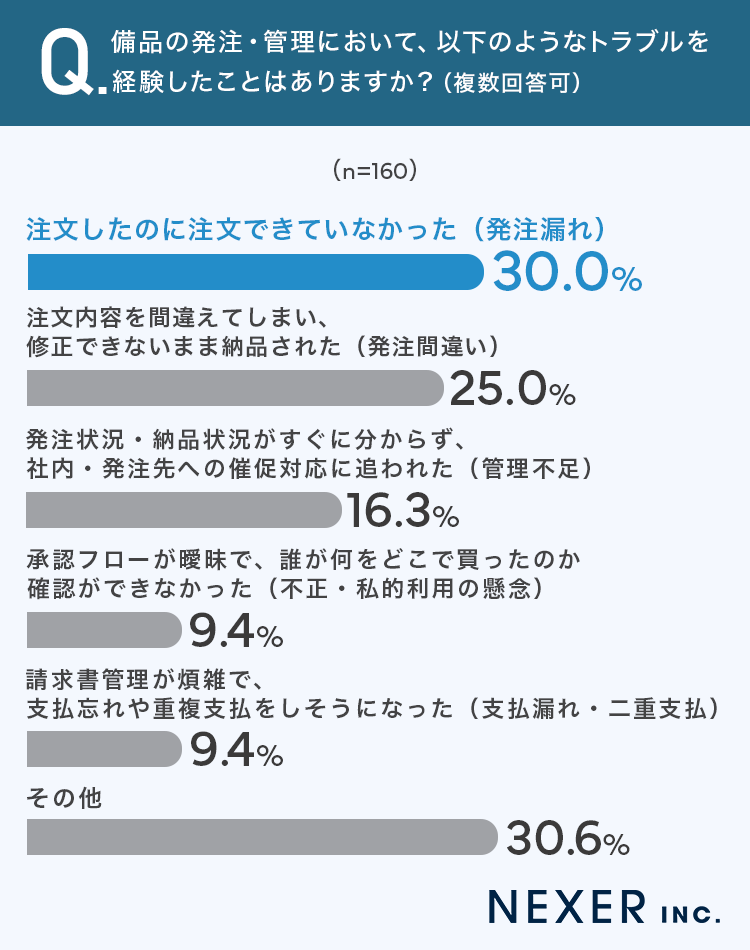 質問4:備品の発注・管理において、以下のようなトラブルを経験したことはありますか?(複数回答可)