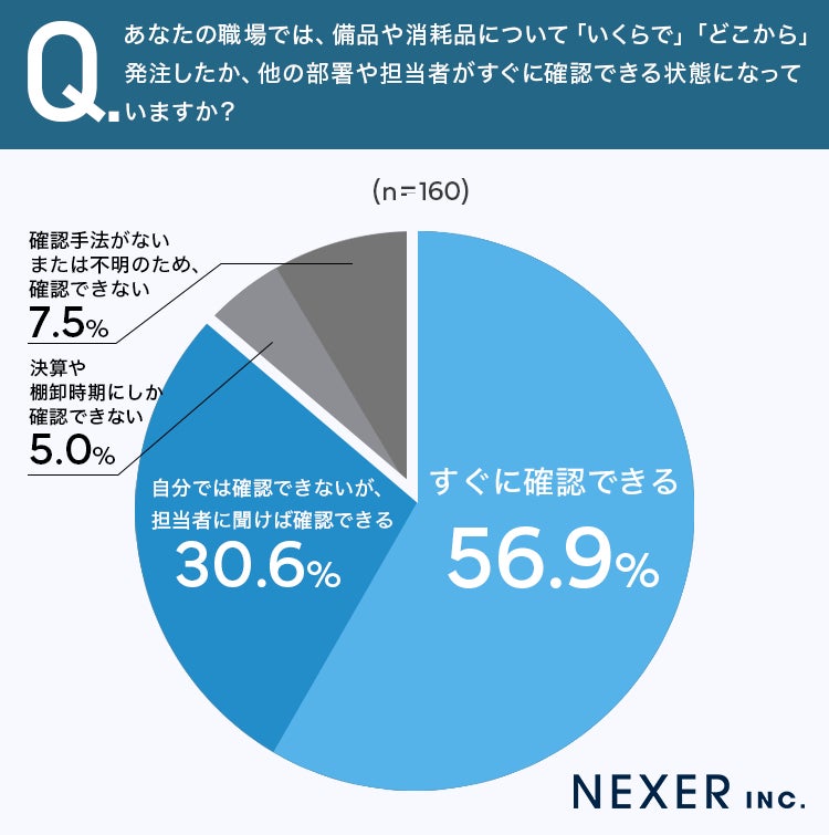 続いて、備品や消耗品の発注情報について、価格や発注先などをほかの部署や担当者がすぐに確認できる状態かどうかを聞いてみました。