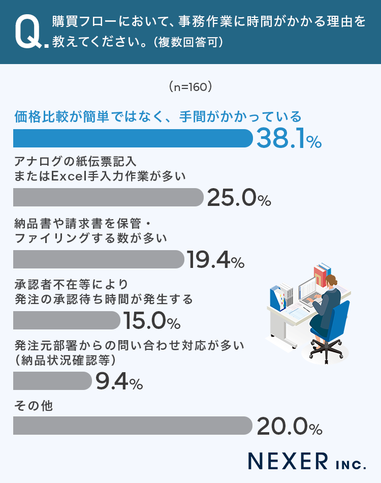 続いて、購買フローにおいて事務作業に時間がかかる理由を聞いてみました。
