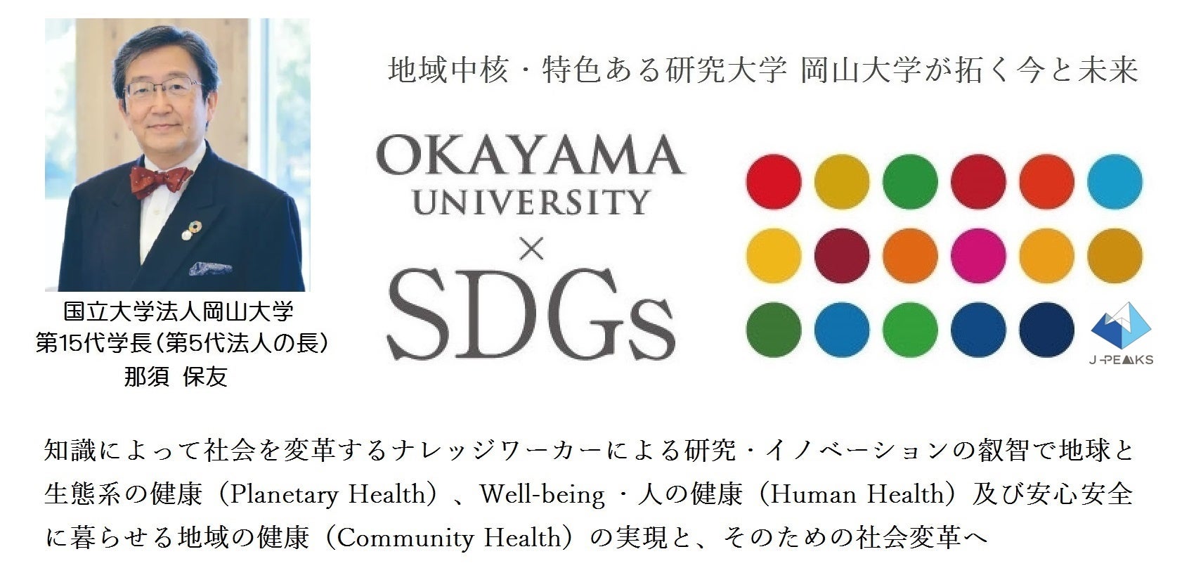 岡山大学 文部科学省「地域中核・特色ある研究大学強化促進事業(J-PEAKS)」に採択~地域と地球の未来を共創し、世界の革新の中核となる研究大学:岡山大学の実現を加速とともに世界に誇れる我が国の研究大学の山脈を築く~