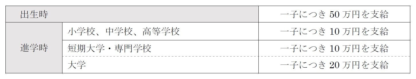 本制度は、正社員本人または配偶者が出産した場合、子ども1人につき50万円を支給し、進学時にも一定の一時金を加算するもので、合計で最大100万円を給付します。