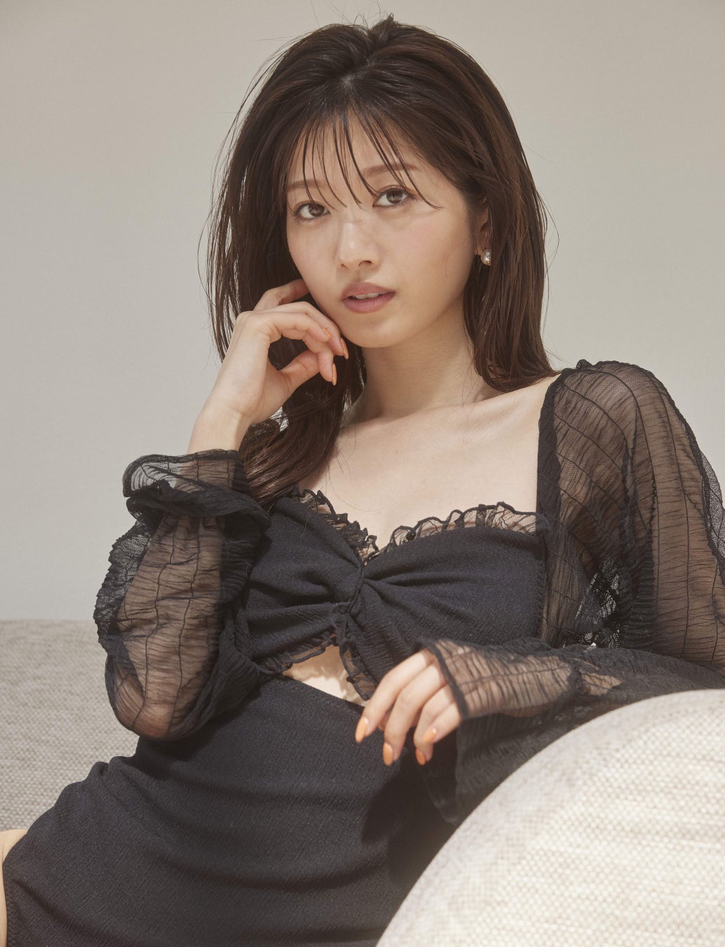 今年らしさ満載のディテールで、シースルーの袖が二の腕周りを優しくカバーしてくれるデザインが嬉しいポイント。胸元のシフォンフリルで優しい表情に仕上げ、袖口にはゴムが入っているのでキュッと巻きあげることも可能です。