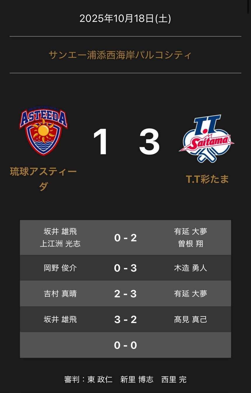 ノジマTリーグ 2025-2026 公式戦 10月18日開催 琉球アスティーダ vs T.T彩たま の試合は、3-1でT.T彩たまチームが勝利しました!