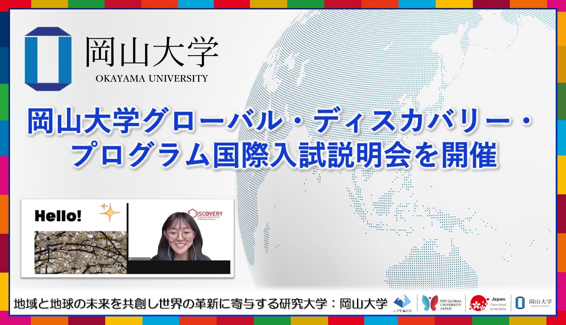 国立大学法人岡山大学(本部:岡山市北区、学長:那須保友)は、2024年9月20日、グローバル・ディスカバリー・プログラムの国際入試説明会をオンラインで開催しました。海外を中心に高校生や保護者の方々など約45人が参加しました。