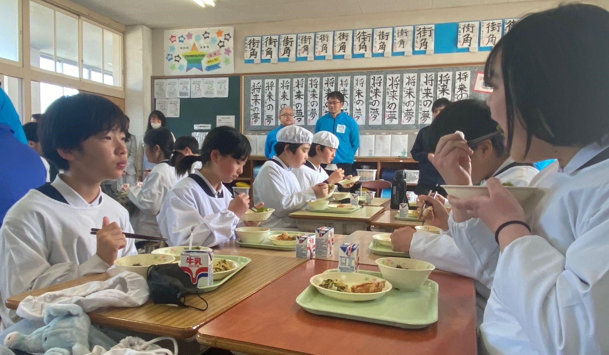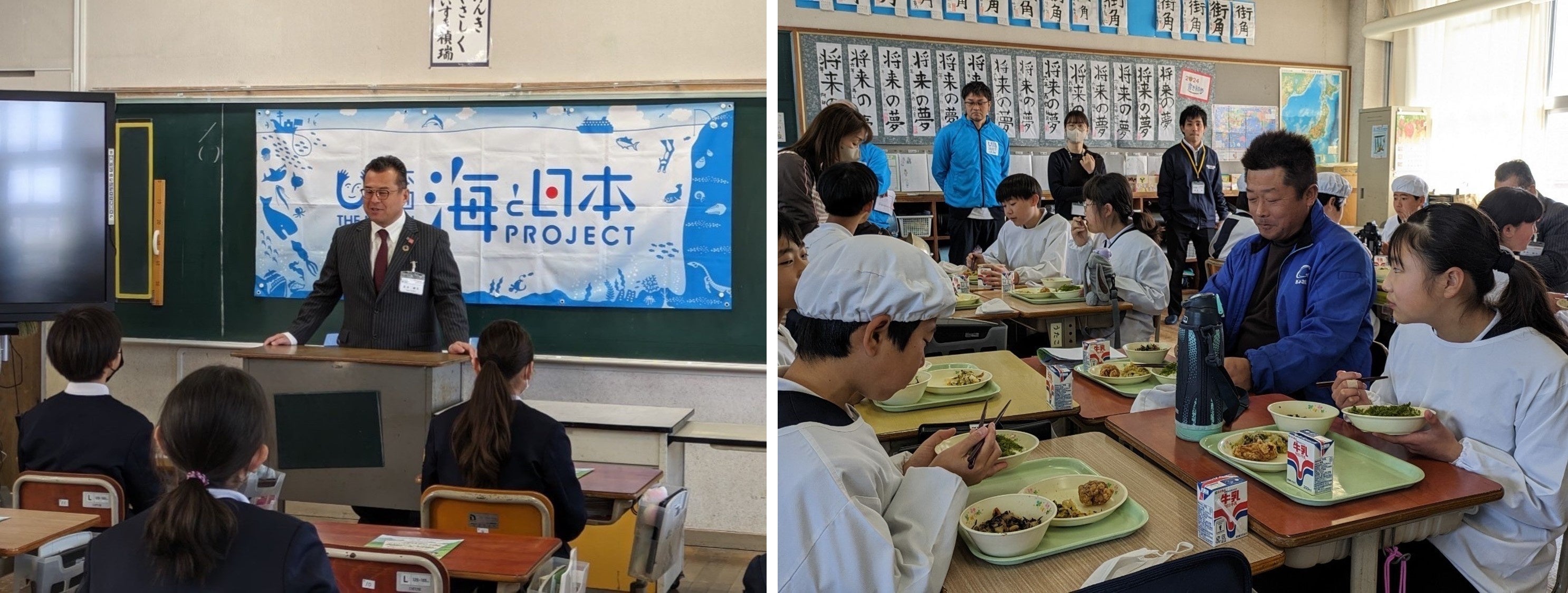 出前事業には、西条市の玉井敏久市長、海苔の生産者の杉本信吾さんにもお越しいただきました。玉井市長からは、「西条市産の海苔は磯の香りが強くて本当に美味しかったですね。これからの時代を担う皆さんには、自然の大切さや偉大さ、たくさんのことを学んでいってほしいと思います。」とお話しいただきました。海苔の生産者の杉本さんからは、「こんな自然豊かな、美味しい海苔がとれる皆さんの故郷を誇りに思ってください。また一方で、地球温暖化、海水温の上昇など、海苔の生育に問題が出ていることもあります。大人の私たちは美しい豊かな自然を皆さんに引継ぐために何ができるか一生懸命考えて、行動しています。皆さんも豊かな自然を守るために何ができるか、考えてみてください。」とお話しいただきました。