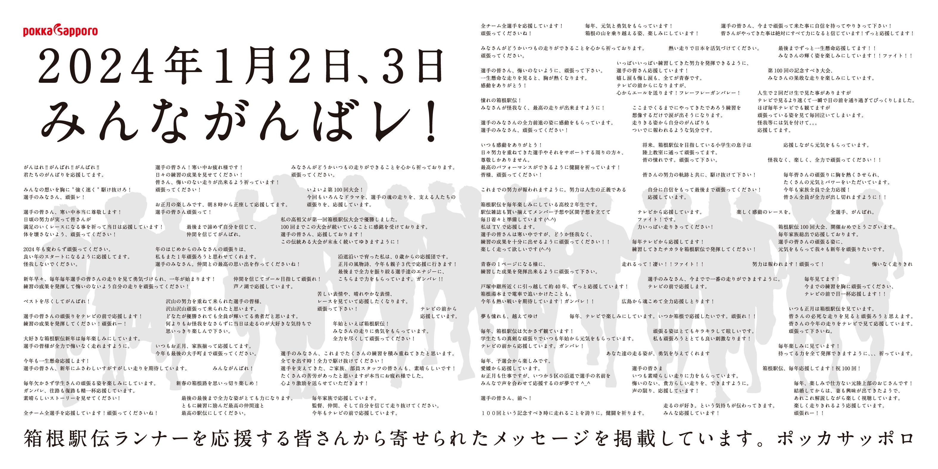 サッポログループは、本年も本大会に出場する選手や大会を支える全ての方々への応援と、大会への協力活動に取り組み、往路ゴール付近では両社の社員がチャリティ販売を行いました。売上金の一部は「箱根トラスト基金」に寄付し、箱根町の自然環境保全に役立てられます。また、ポッカサッポロフード&ビバレッジでは、キャンペーン内でランナーに向けた応援メッセージを募集して、パネル掲示し、箱根駅伝をさらに盛り上げました。