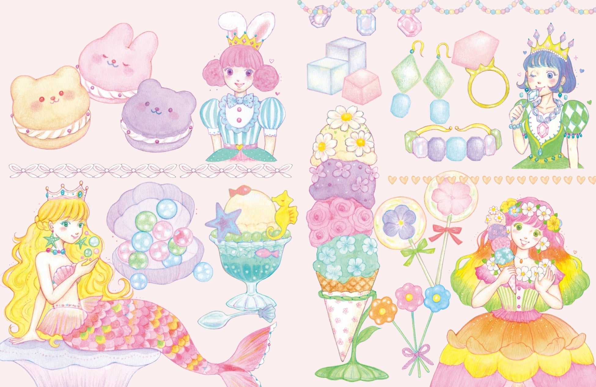 本書は、2022年に刊行して現在8刷り、大反響の『ゆめみる おひめさま図鑑』(2022年発売)に続く第2弾です。「おひめさま」×「おかし」がテーマのたけいみきさんワールド全開の夢いっぱいの内容です。主人公の女の子がお菓子のおしろを冒険するストーリーをベースに、色とりどりのお菓子を紹介します。