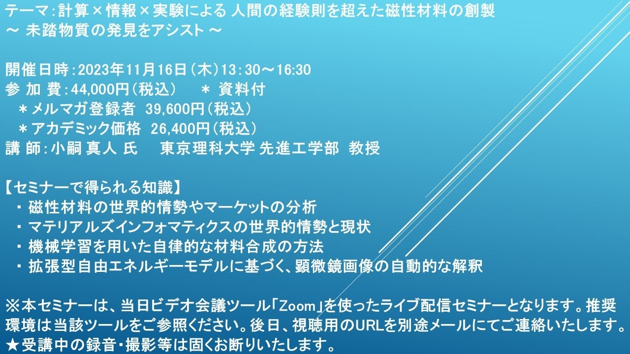 【ライブ配信セミナー】計算×情報×実験による 人間の経験則を超えた磁性材料の創製 〜 未踏物質の発見をアシスト 〜 11月16日(木)開催 主催:(株)シーエムシー・リサーチ
