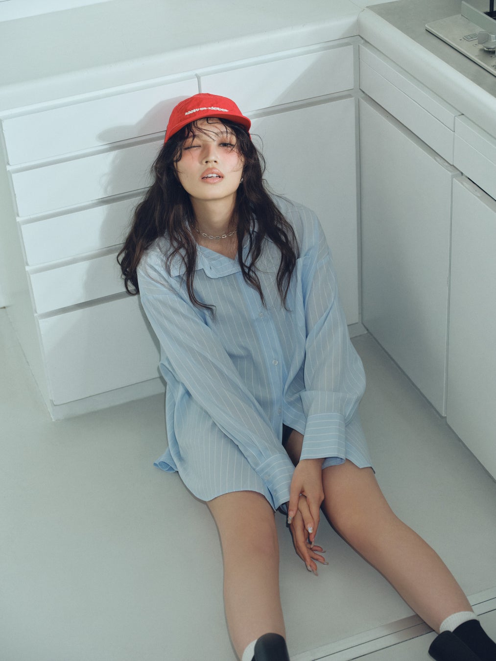 ライトブルーにトレンドのレッドカラーキャップでアクセントをプラス♪